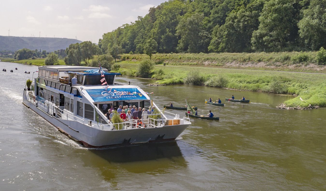 Entdeckt das Wesertal vom Wasser aus, bei gemütlichen Schifffahrten. Bei Rundfahrten ab Bad Karlshafen mit dem Weserschiff "Hessen" erfahrt Ihr Spannendes zum Dreiländereck Hessen, NRW und Niedersachsen. Ihr erblickt die Hannoverschen Klippen, auf denen der Weser-Skywalk trohnt. Event- und Sonderfahrten sowie Streckenfahrten, z.B. zum Schloss Corvey in Höxter sind ebenfalls möglich.